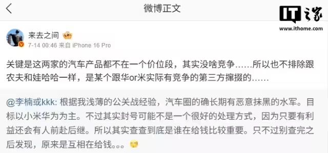 IT之家注意到,微博 CEO 王高飞对此进行回应:“关键是这两家的汽车产品都不在一个价位段,其实没啥竞争…… 所以也不排除跟农夫和娃哈哈一样,是某个跟华 or 米实际有竞争的第三方撺掇的……”