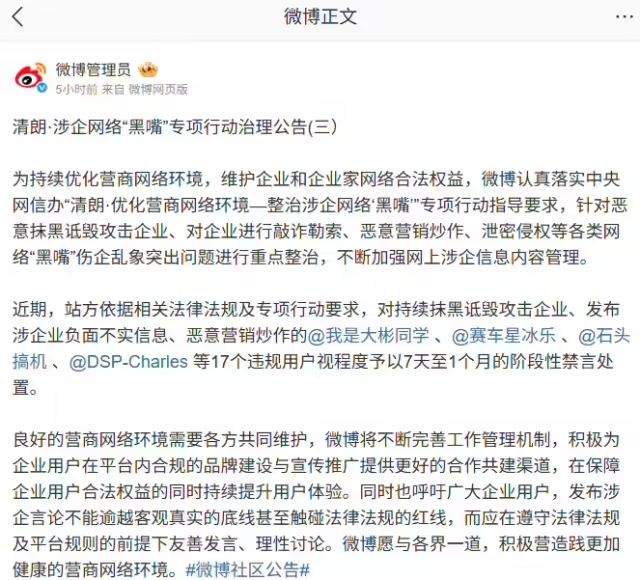 微博官方也公告了更具体的原因:“持续抹黑诋毁攻击企业、发布涉企业负面不实信息、恶意营销炒作”。