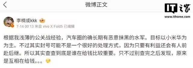 前魅族高管、怒喵科技创始人李楠 7 月 14 日发文称:“根据我浅薄的公关战经验,汽车圈的确长期有恶意抹黑的水军。目标以小米华为为主。”